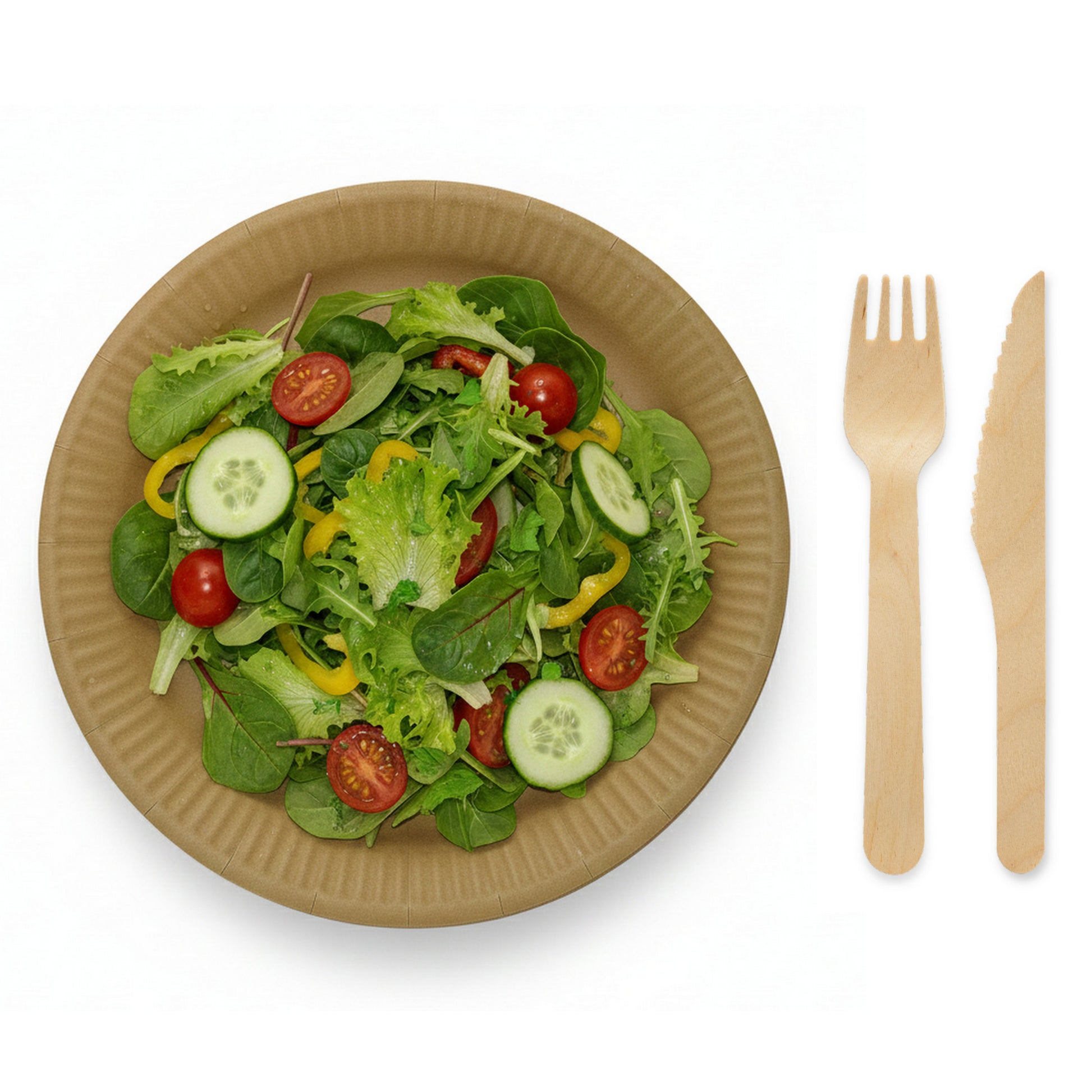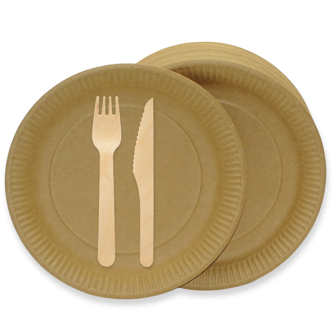 300 tlg. Bio Einweg Set: 100 Pappteller braun + 100 Gabel + 100 Messer Holzbesteck